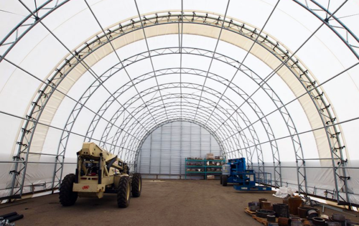 Our double-truss portable membrane buildings are great for industrial, agricultural, and commercial use. Whether you need to store equipment, stockpile materials, build a work-space or manufacturing plant, our portable double-truss shelters are a great solution to any building need you might face!